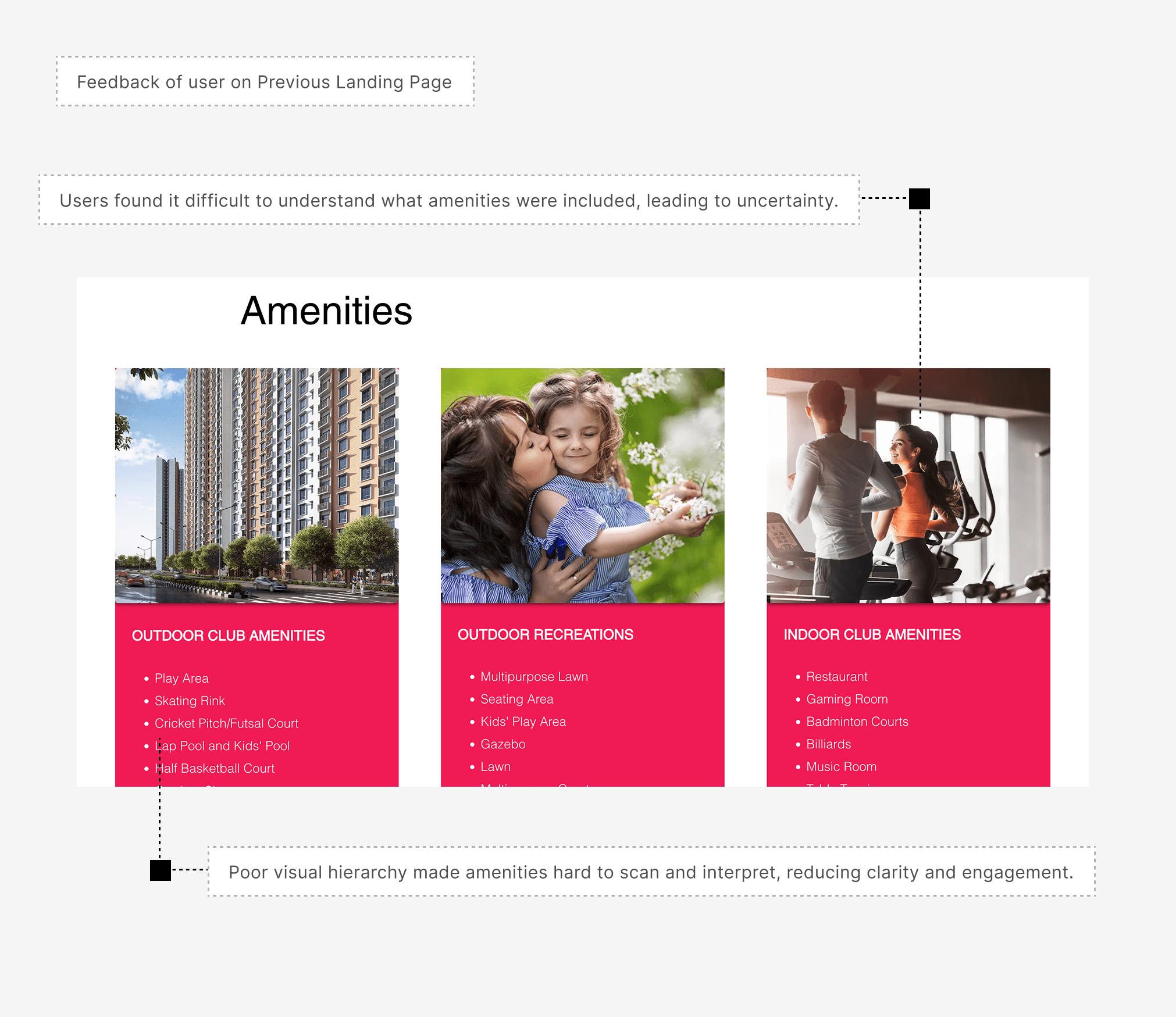 Users found the landing page difficult to understand due to text-heavy content and lack of visual clarity. Since property buying is a trust-driven decision, a more engaging and visually guided experience was needed to build confidence and encourage action.